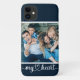 A capa de telefone personalizada apresenta sua foto favorita em um quadro branco e fundo azul escuro com um design de cobertura de script branco "meu coração" que inclui um elegante florescimento e detalhes cardíacos.