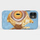 Peixe-ouro engraçado e fofo (pestana) para você. Um peixe-dourado meio assustador olhando para trás de fundo azul, kawaii!