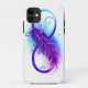 Símbolo infinito com uma bela pena pintada em cores roxas e azuis brilhantes sobre fundo branco.