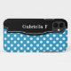 Gabinete iPhone 5 do Na moda projetado com bolinhas brancas sobre padrão azul, um quadro preto sobre o lado esquerdo e personalizado com seu nome ou texto personalizado em branco sobre o quadro preto. Este design é perfeito para o uso vertical e horizontal do iPhone 5.