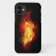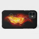 Pena de pavão brilhante feita de fogo e chamas sobre fundo negro.