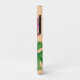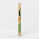 Um lápis de aquarela desenhando uma flor rosa tropical com folhas verdes.