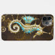 Fundo de madeira marrom com mar, cume mecânico, um volante antigo, âncora dourada e várias engrenagens de ouro e latão. Estilo Steampunk.