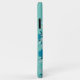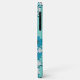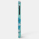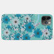 Uma capa de telefone com padrão floral sobre fundo azul claro. O padrão é constituído por flores azuis e brancas com centros escuros, folhas verdes e bagas pequenas rosa. As flores são dispostas de forma densa, sobreposta, criando um design rico e texturizado. A capa de telefone tem um acabamento brilhante, e as lentes da câmera são visíveis no canto superior esquerdo. O estilo geral é feminino e decorativo, com foco em elementos naturais. A paleta de cores é macia e calmante, com um equilíbrio de tons legal e quentes.