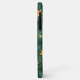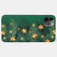 Uma capa de telefone verde com tema de Natal, com galhos de pinheiros e estrelas ouros, com pequenas luzes.