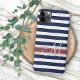 Padrão de listras brancas e azuis escuro contemporâneo. Com uma faixa para personalizar ou personalizar com o monograma de sua escolha. Belo, moderno e legal cobrir para o motif motif motif motif motif motif motif, experiente e amante da arte, que quer proteger seu telefone de poeira e sujeira, visto e lágrimas. Este design está disponível no Apple iPhone 6, 7 e 8 Plus, 10 ou X, XR, XS, 11, 12, 13 Mini, 14, 15 Plus e no Pro Max Celphone capas. Mostre seu estilo, olhe a moda da moda e sinta na moda com um design único em um acessório de dispositivo móvel de sua escolha.
