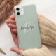 Esta elegante capa de telefone personalizada apresenta um monograma e primeiro nome em uma escrita moderna em preto e branco sobre um fundo verde da moda.