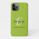 Esta elegante capa de telefone personalizada apresenta um monograma e primeiro nome em um script preto e branco moderno em um fundo de verde limão de tendência, com o nome do cheio abaixo em fontes de sans negras serif.