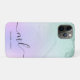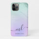 design de capas de iphone personalizada e elegante com mármore verde-claro, textura púrpura pastel e fonte elegante de caligrafia. Personalize o produto com suas iniciais e seu nome.