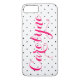 capas de iphone na moda com padrão de bolinhas preto e branco e caligrafia moderna rosa-quente. Este caso de eletrônicos personalizável será perfeito como presente.