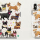 Um padrão lúgubre com vários cães de desenho animado em diferentes poses e expressões.