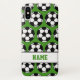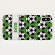 Este caso desportivo do iPhone 6 caracteriza bolas de futebol preto e branco bonitos em um fundo verde.
