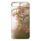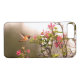 caso do iPhone 6 com uma foto de um néctar sorvendo do colibri de algumas flores cor-de-rosa. O colibri rufous está voando e é cercado pelas folhas e pelas flores de um arbusto de corinto de florescência vermelho que floresce no primavera.