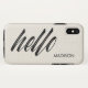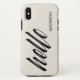 A palavra "olá" em uma fonte moderna de escrita cursiva preta ocupa dois terços do elegante caso com um fundo de textura falsa de canvas bege impresso. Um nome personalizado está no canto inferior direito em uma fonte de sans preto simples e menor. Personalize-o adicionando seu nome ou texto na barra lateral. Faça um presente personalizado de excelente. Para ver mais itens do Hello Script, clique no link "Rocklawn Arts" abaixo. Imagem criada digitalmente. Copyright ©Claire E. Skinner. Todos os direitos reservados.