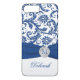 A caixa floral azul e branca moderna Monogrammed do iPhone 7 da case mate da cor damasco com fita IMPRESSA e o falso IMPRESSO gravados olha o broche de cristal. Personalize-a para adicionar seu conhecido, a inicial, ou o outro texto. Se você precisa o auxílio, envie por correio electrónico niteowlstudio@gmail.com.
