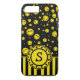Refrigere amarelo minúsculo o design feliz colorido do teste padrão da cara das bolinhas no preto. A fita retro do monograma da flor da listra, personaliza com sua inicial.