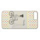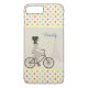 Presentes e acessórios chiques e modernos, personalizados com uma menina elegante que monta uma bicicleta com a toalha de Eiffel no fundo. Decorado com um teste padrão de bolinhas multi-colorido.