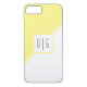 iPhone 8/7 geométrico amarelo e branco com monograma. A frente inclui duas faixas diagonais de um amarelo e um branco que separam a placa em dois triângulos. Um quadrado branco está no centro com seu monograma.