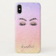 Capa de telefone feminina moderna e iridescente com olhos de maquiagem e sobrancelhas sobre uma blusa holográfica rosa ombre, mauve roxa e fundo brilhante amarelo. ++++++++++++++++ Personalize-o com o seu nome e monograma rosa / nome inicial.++++++++++ Pode ser um presente personalizado bonito para um amante de moda, um artista de maquiagem ou um proprietário de salão de beleza.