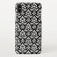 Design de padrão de superfície de damasco decorativo em detalhes brancos sobre fundo preto.
