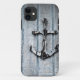 Âncora de madeira na casa de campo de madeira azul da praia.