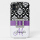 Caixa preto e branco à moda com um impressão da foto de uma fita roxa do cetim, broche quadrado da case mate do iPhone 5 da cor damasco com impressão da foto dos diamantes brancos. Personalize esta caixa elegante do iPhone 5 com sua inicial do nome e do monograma na parte inferior do design em um fundo branco. Faz a um grande acessório de forma para seu iPhone 5. gráficos de Elke Clarke© licenciados.