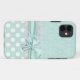 Um gabinete de mint verde e branco para o iPhone 5, com um verde de menta na cor damasco verde, no topo, e um verde de menta com padrão de bolinhas branco, na parte inferior. Gráficos de uma banda de rendas brancas e uma fita e arco verde da casa da moeda correm pelo meio entre as duas partes de trás. Personalizar para adicionar seu próprio texto. Excelente maneira de olhar para o na moda e proteger seu dispositivo eletrônico ao mesmo tempo.