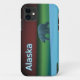 Um urso polar (Ursus maritimus) vagueia o gelo durante a longa noite polar; o Norte brilha em vermelho e verde à distância. A leitura de texto "Alaska" em azul e branco brilhantes também é exibida.