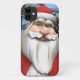 Renderização digital 3D de um Papai noel andando e carregando um saco com presentes numa floresta de inverno