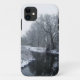 Rio com neve e árvores.