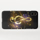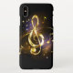 Jewelry, gold, musical treble clef with golden notes and stars on black glowing background.