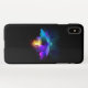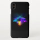 Voz mecânica, antiga, com lâmpada e asas finas brilha cor de laranja, roxo, turquesa sobre fundo preto. Estilo Steampunk.