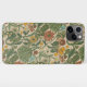 Seamless vintage botanical pattern featuring winding green vines, leaves, and stylized flowers in shades of orange, yellow, white, and muted blue against a beige background.