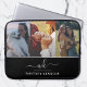 Laptop com uma elegante caligrafia, primeiro e sobrenome, monograma e modelo de nome personalizado minimalista branco em fundo preto. Adicione suas três fotos favoritas para criar sua própria bolsa de laptop de colagem de fotos. Um na moda e pensativo presente personalizado de aniversário, dia de as mães, graduação ou aposentadoria.