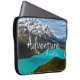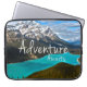 Esta bolsa de laptop é perfeita para o trotador do globo! Caracteriza um fundo impressionante do lago Peyto em Banff, Alberta, Canadá. Sobre a vista das montanhas e o lago de turquesa são as palavras "aventura esperam" no texto branco.