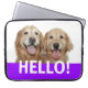 Diga olá!! Esta bolsa de laptop caracteriza uma fotografia de dois cães de sorriso do golden retriever, com a palavra OLÁ!! em um fundo roxo.