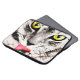 Gato de gato malhado feroz com perfurar a bolsa de laptop amarela dos olhos
