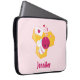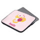Uma bolsa de laptop personalizada com a imagem de uma abelha-mãozinha, riscada, rosa e branca. Um pedaço de pente de mel amarelo atrás. Uma carta selada com coração e um grupo de corações flutuantes também fazem parte do design.