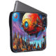 +{ AI Art }+ Uma nave espacial colorida paira sobre uma cidade medieval em outro planeta.