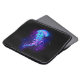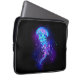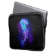 Água-viva grande, azul, desenhada artisticamente, brilhante, brilhante, com longos tentáculos sobre fundo preto com bioluminescência roxa. Água-viva luminosa.
