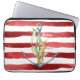 Design de aquarela artística com tema náutico, essa bolsa de laptop tem um padrão colorido de listras vermelhas em traços de aquarela pintados. Uma âncora azul embelezada com plantas marinhas e oceânicas adiciona atração costeira e praia chorona à design. Personalize o modelo de texto com seu nome, iniciais de monograma ou outro texto desejado.