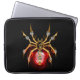 Aranha mecânica, com pá-pá de ouro, engrenagens de latão e uma lâmpada de vidro vermelha sobre fundo preto. Estilo Steampunk.