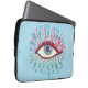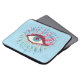 Bolsa de laptop psicodélica com uma ilustração colorida de um olho azul estranho com grandes pestanas roxas, lágrimas azuis claras que fluem por toda parte e muitos elementos cor-de-rosa e verde - extensões das pestanas.