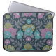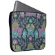 Esta bolsa de laptop tem flores em tons de roxo, azul e verde-oliva cercados por frondes de samambaia roxa e mudas e folhas sobre um fundo azul escuro.