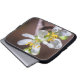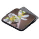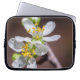 Uma fotografia de proximidade captura a delicada beleza das flores de ameixa. A flor, com suas cinco pétalas, está em flor de cheio, mostrando seu centro amarelo brilhante com numerosos estames. As pétalas são moles e translúcidas, com uma sutil bainha. A flor está presa a um galho fino, com fundo desfocado de matizes castanhos e verdes.