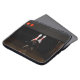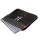 Uma bolsa de laptop com uma foto de duas pinos de boliche prestes a ser derrubada por uma bola de boliche.