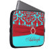 Esta bolsa de laptop personalizada de aqua e damasco vermelho com fita vermelha FAUX e broche de joia tem uma caixa de texto para você personalizar com seu próprio nome, monogramas, nome comercial ou outro texto. Se precisar de ajuda para personalizá-lo da maneira desejada, envie um e-mail para niteowlstudio@gmail.com para obter ajuda.