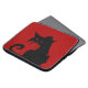 Um gato preto com pelo pontiagudo e olhos vermelhos perfurantes se senta sobre um fundo vermelho profundo. Seus olhos parecem brilhar, acrescentando uma qualidade estranha e sobrenatural à sua aparência já misteriosa.