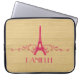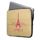 Bolsa de laptop francesa elegante e quic, com fundo de aparência falsa em madeira e design de torre Eiffel em magenta, enfeitiçada com cascatas de espirais na moda. Esta design de moda e moda é fácil de personalizar com o texto personalizado de sua escolha. Clique em "Personalizar" para encontrar mais opções de personalização.