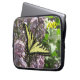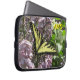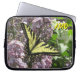 Borboleta preta e amarela, fechando o néctor de uma fileira de flores azuis.